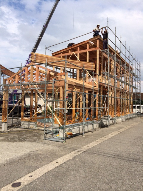 今日はチーズケーキで有名なボンボン洋菓子店様の上棟でした。晴天と段取りのいい大工さんたちのおかげで初日に予想以上進みました(^^)