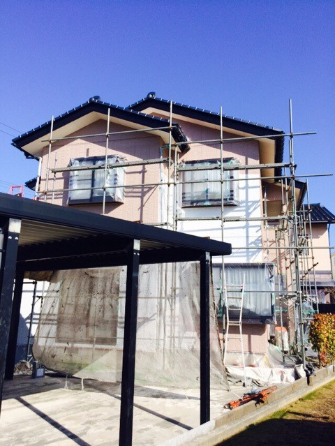 富山市A様邸の外壁塗装の仕上げ段階です。1月は積雪が多かったですが2月は日中の気温が上がり効率よく進んでいます(^^)
