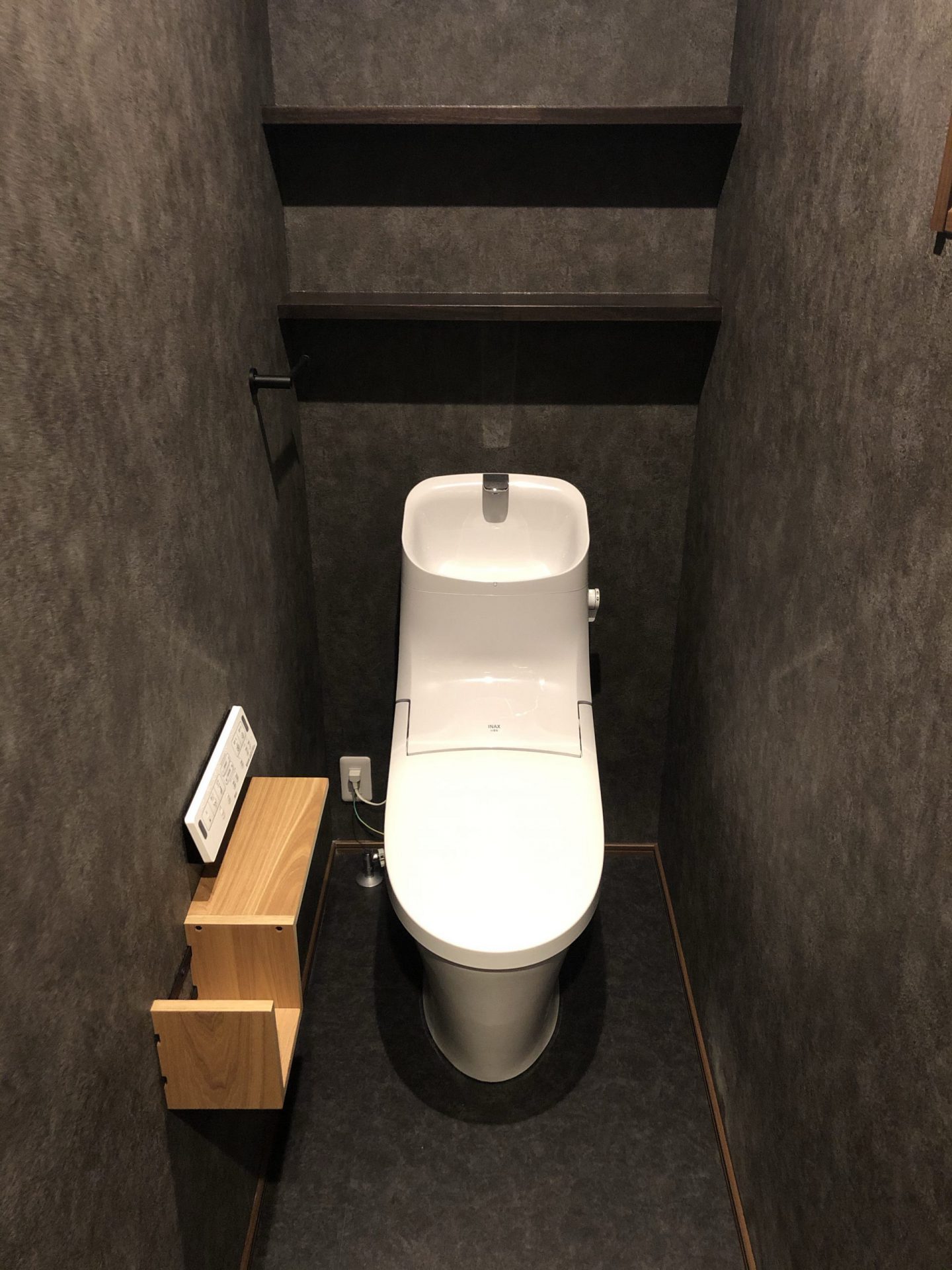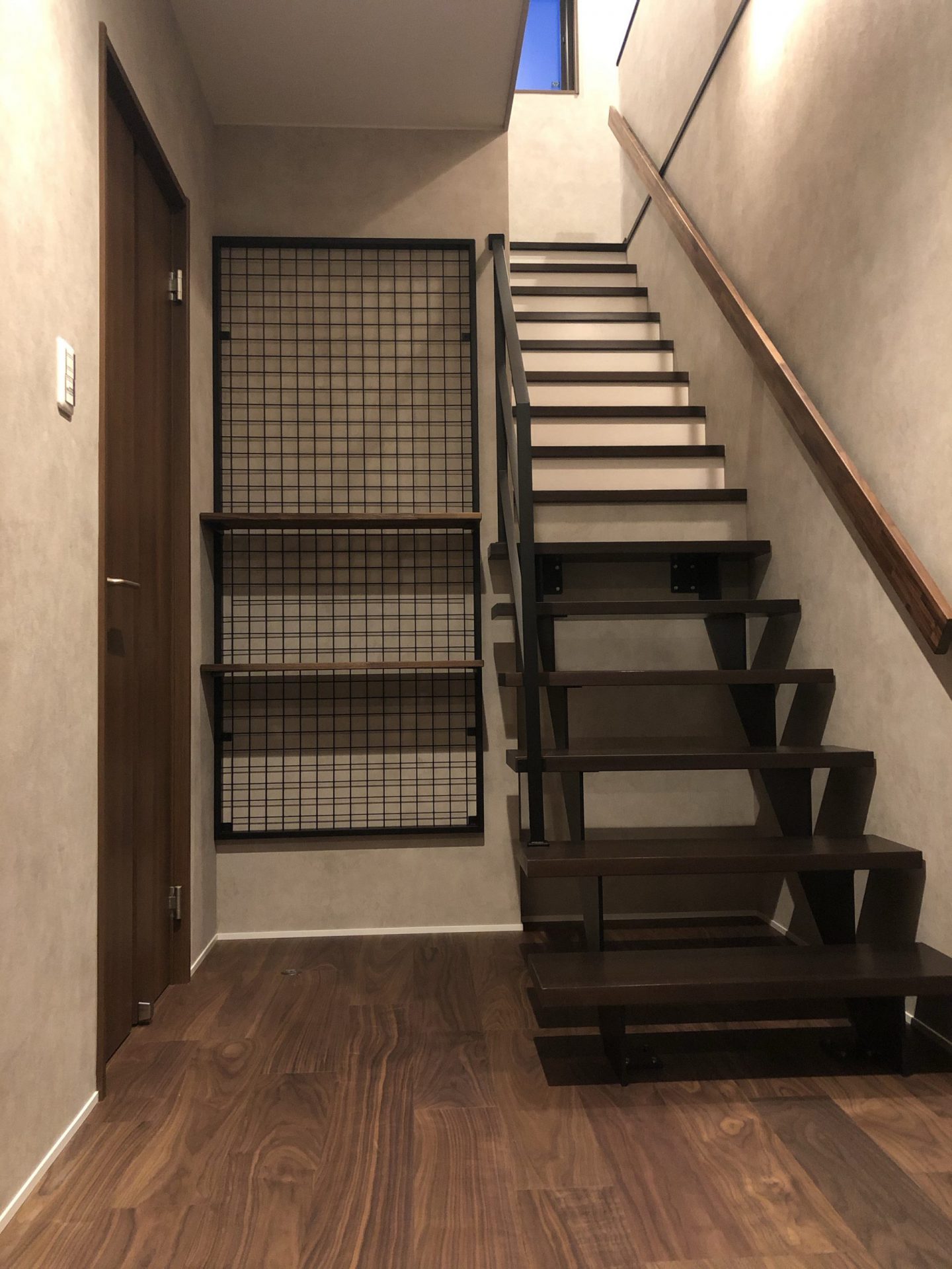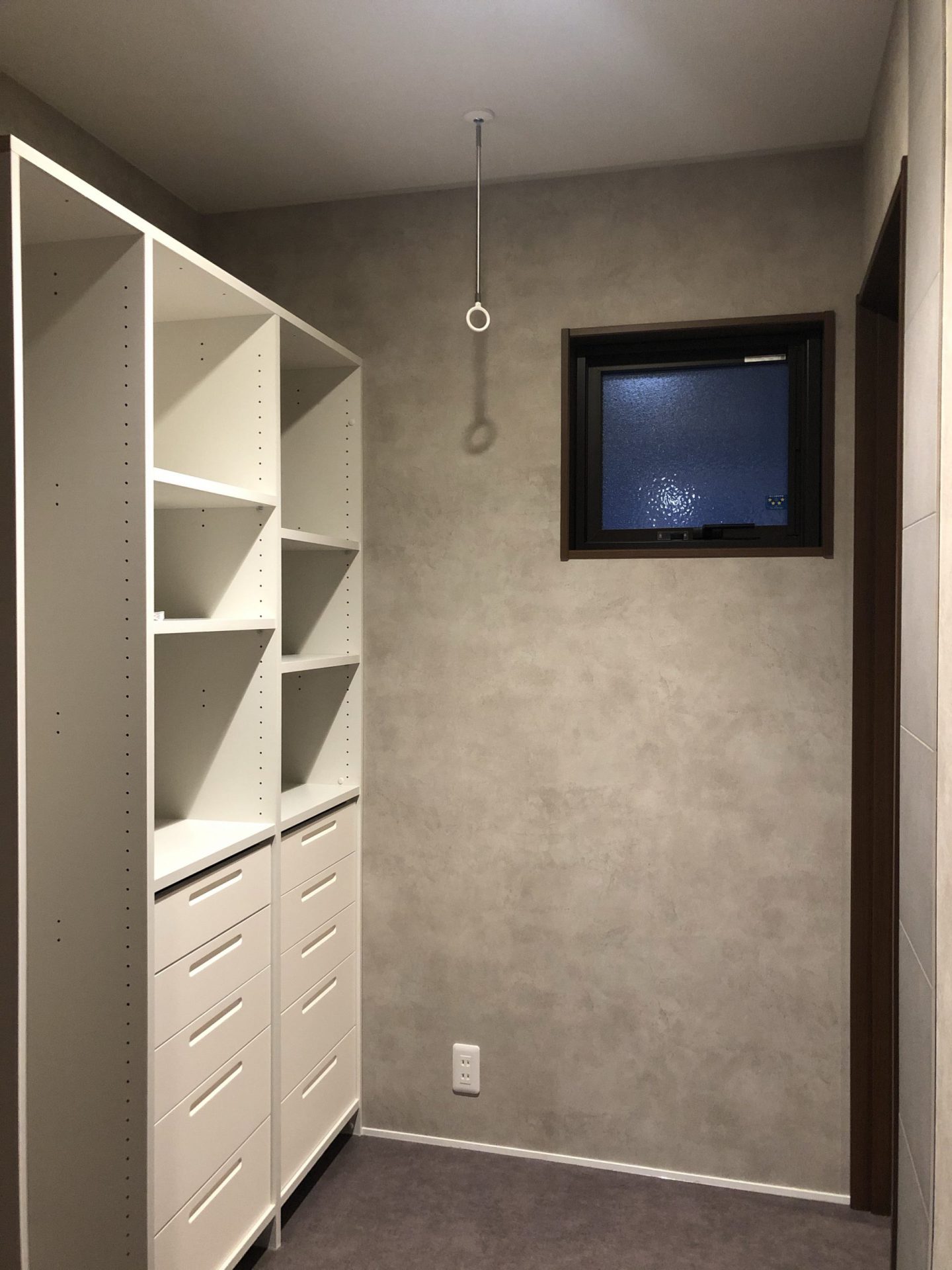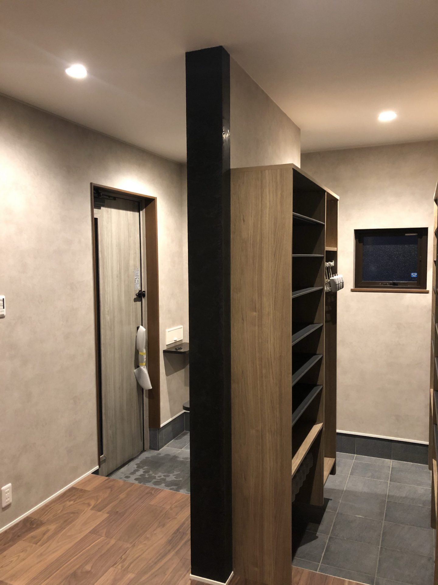お施主様の思いで壁紙を玄関から二階廊下、収納までグレー系で仕上げました。