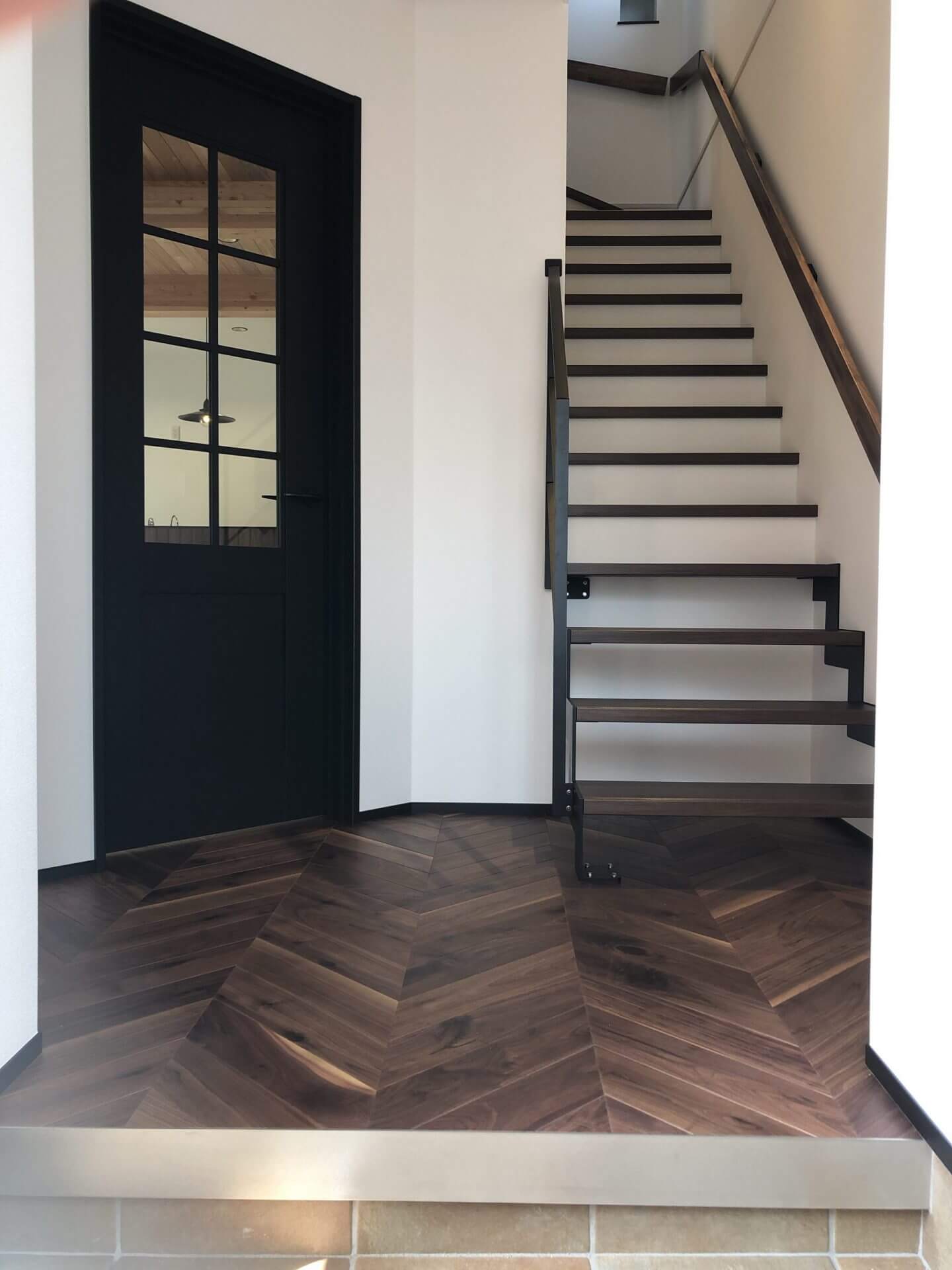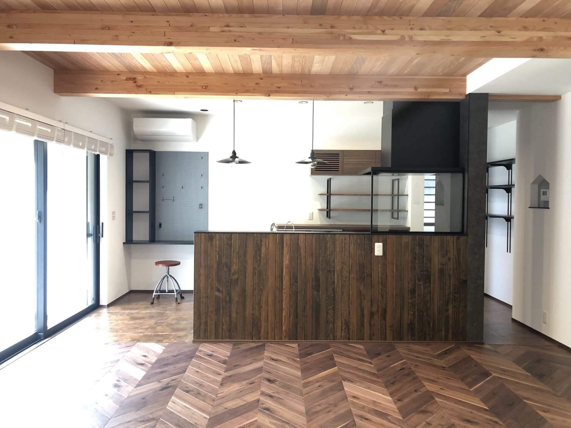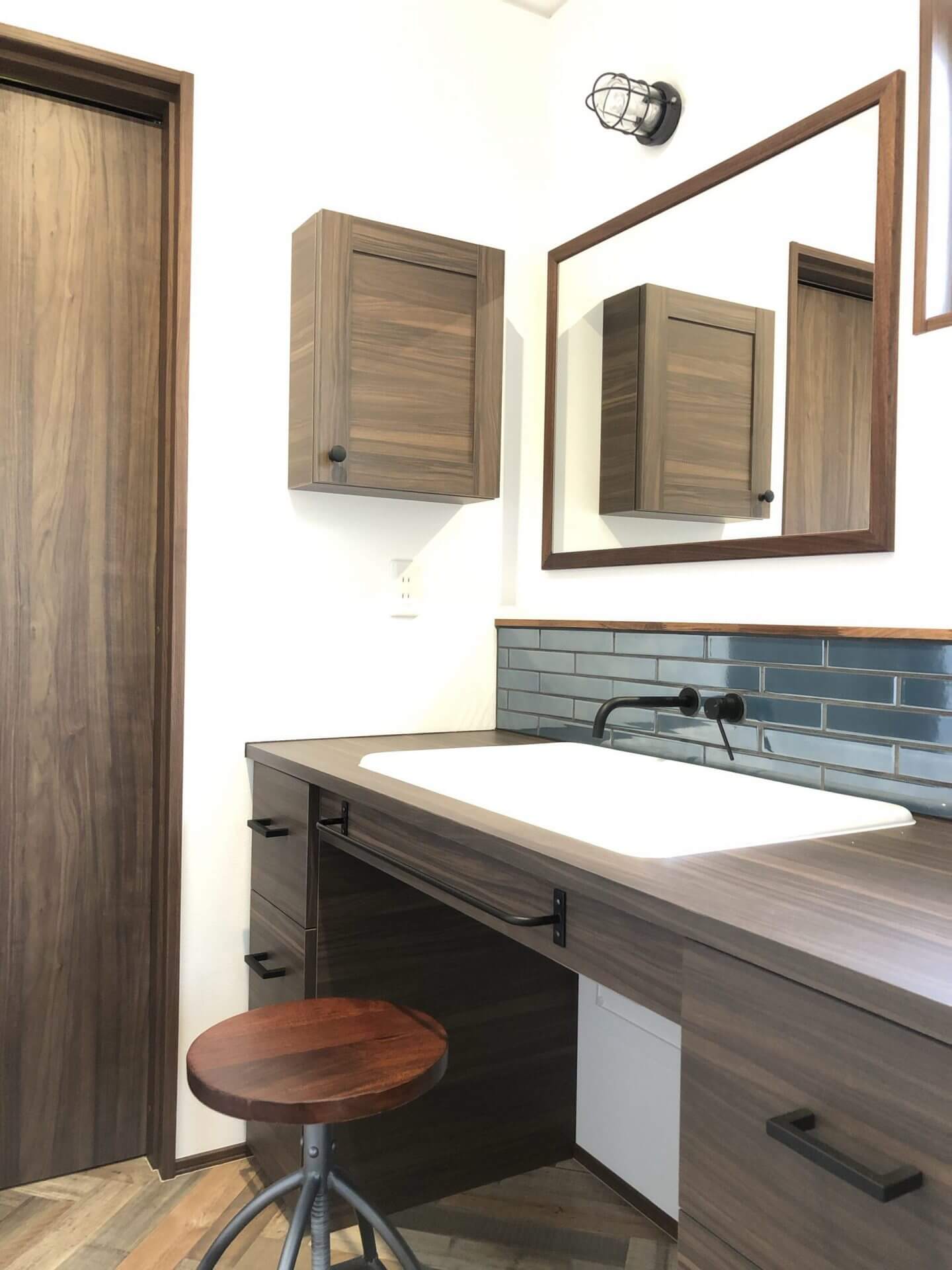 内装もこだわりLDKの床はウォルナットのヘリンボーン、洗面化粧台はお施主様の書かれた図面を元に全造作で作りました。