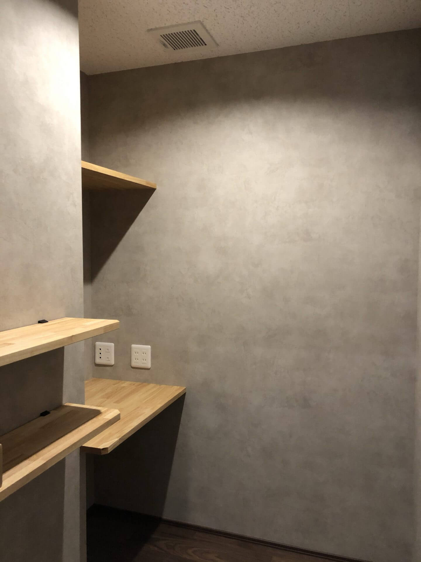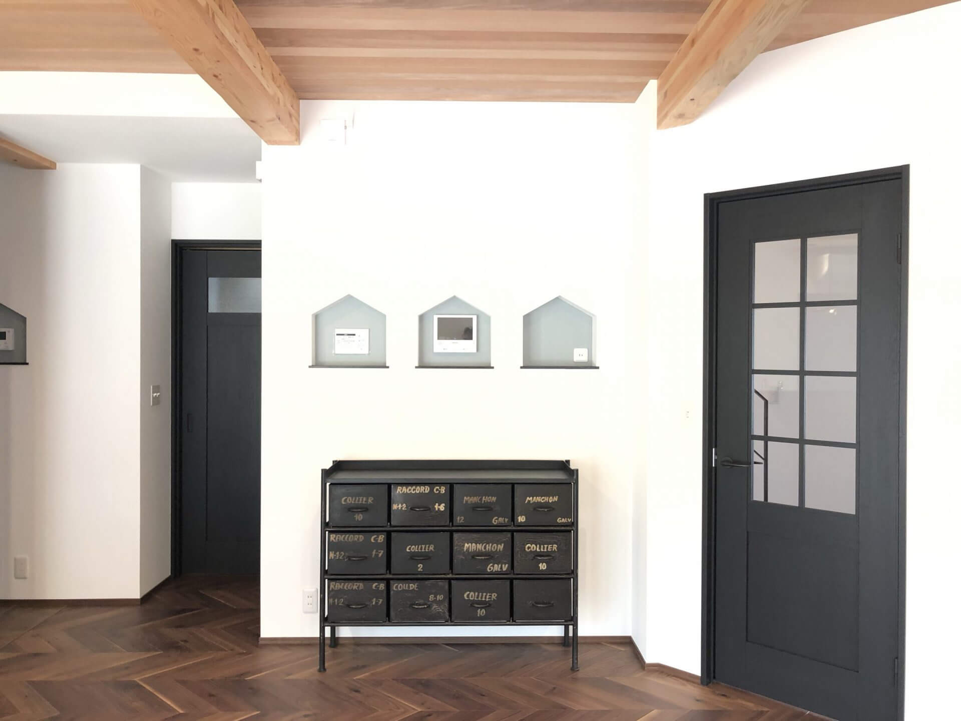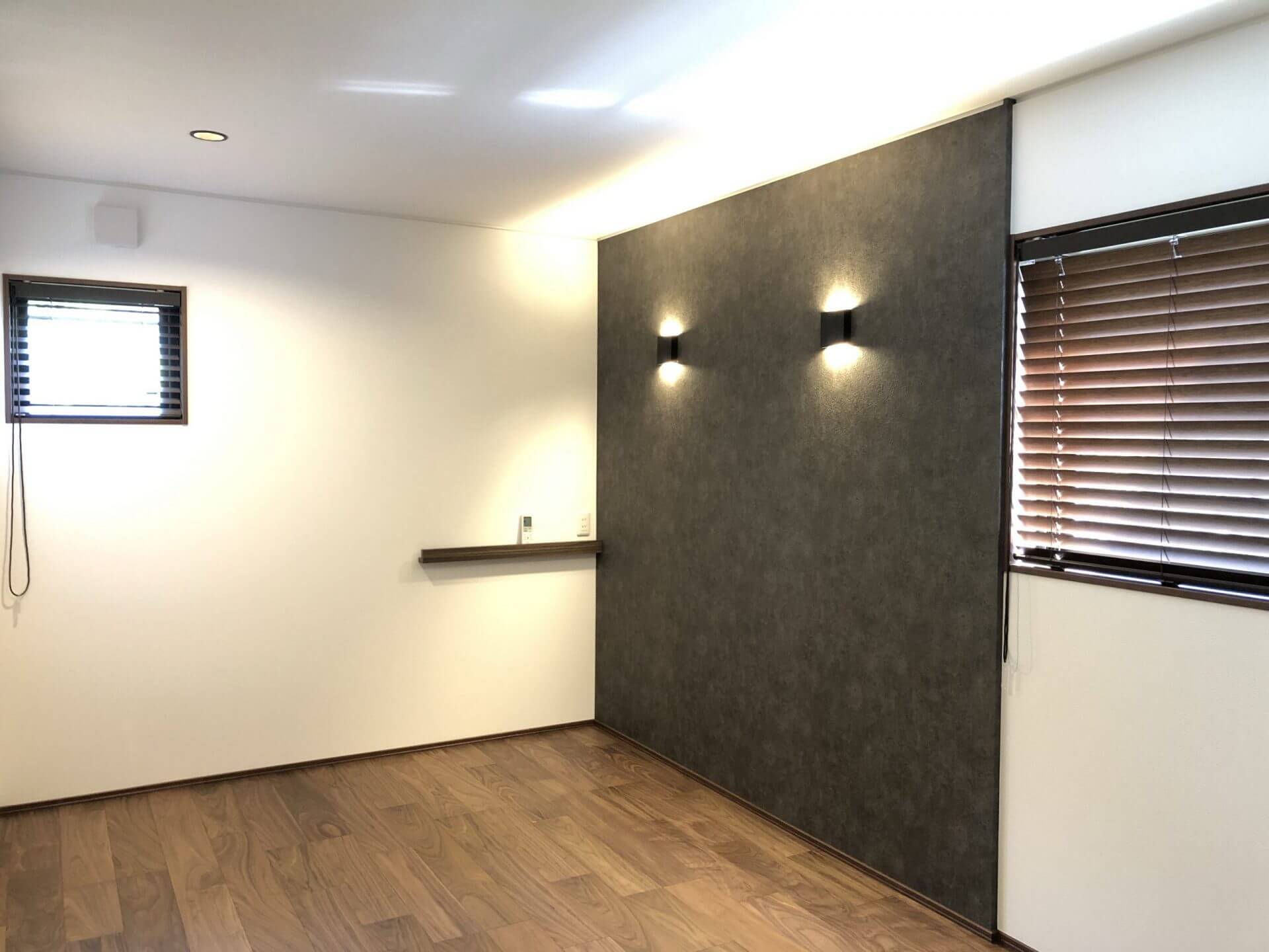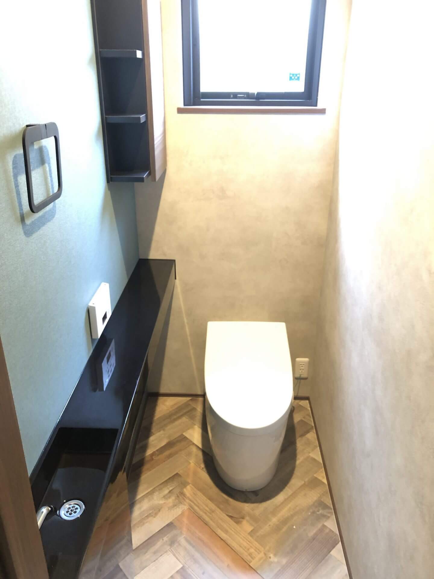 内装もこだわりLDKの床はウォルナットのヘリンボーン、洗面化粧台はお施主様の書かれた図面を元に全造作で作りました。